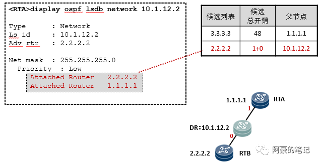 RTA将候选列表中候选总开销最小的节点10.1.12.2移到最短路径树上,并从候选列表中删除。因节点10.1.12.2为DR,接下来检查Ls id为10.1.12.2的Network-LSA,如下图所示。