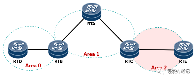 但是Area2并没有与Area0直接相连,因此RTC并非实际意义上的ABR,它也就无法向Area1中注入用于描述到达Area2内网段路由的Type-3 LSA,当然也无法向Area2中注入用于描述到达Area0及Area1内网段路由的Type-3 LSA,这样,Area2就形成了一座孤岛。