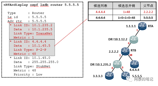 第三个P-2-P连接中,Link ID为4.4.4.4,Metric=48,父节点到根节点的开销为1,候选总开销为49,加入候选列表。