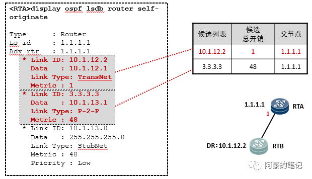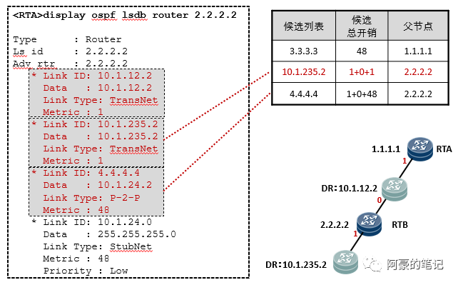 如上图所示,根节点RTA的Router-LSA中有TransNet中Link ID为10.1.12.2 Metric=1和P-2-P中Link ID为3.3.3.3 Metric=48的两个连接,被添加进候选列表中。