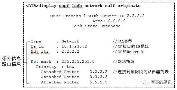 Attached Router:连接到该MA网络的路由器的Router-ID(与该DR建立了邻接关系的路由器的Router-ID,以及DR自己的Router-ID)