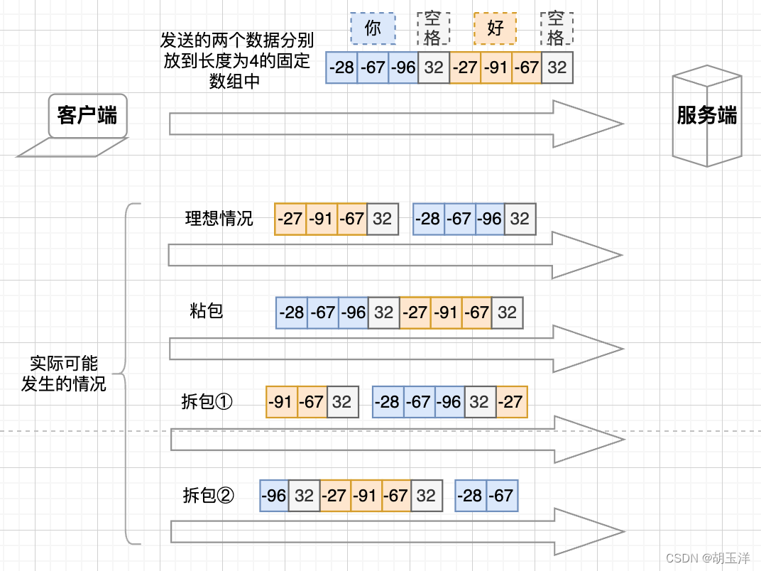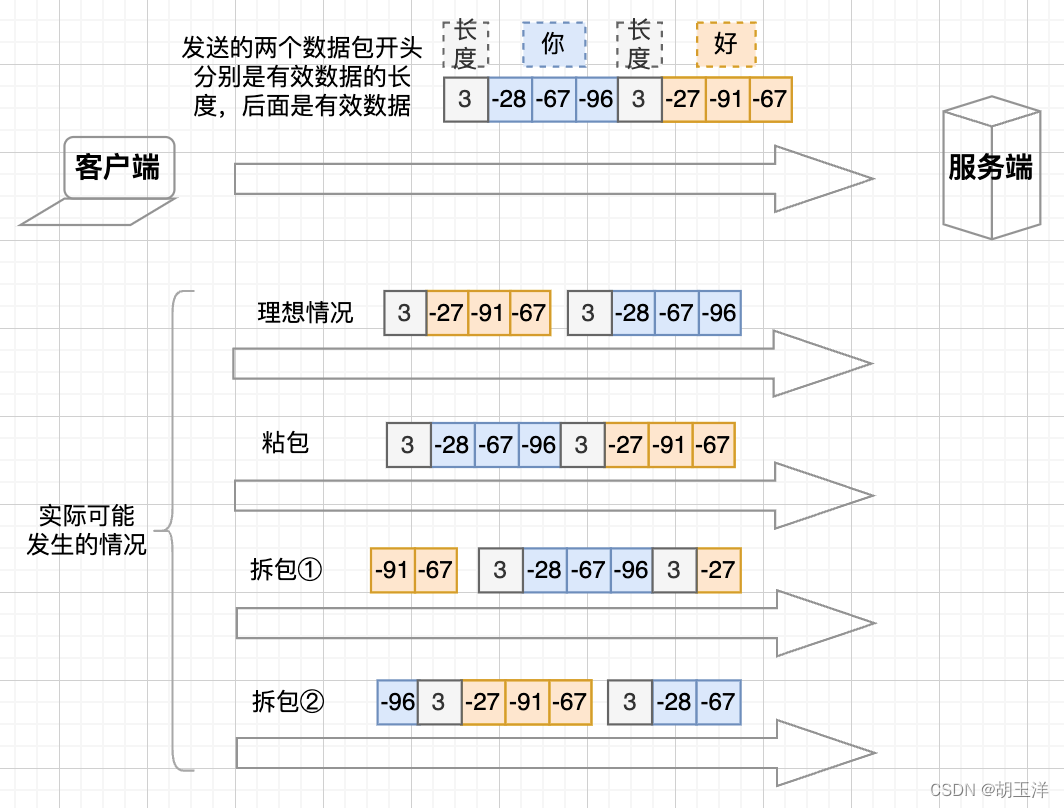 从逻辑上来说,客户端先后向服务端发送了两段数据包:“你”和“好”对应的字节数组。实际上可能会发生很多种情况: