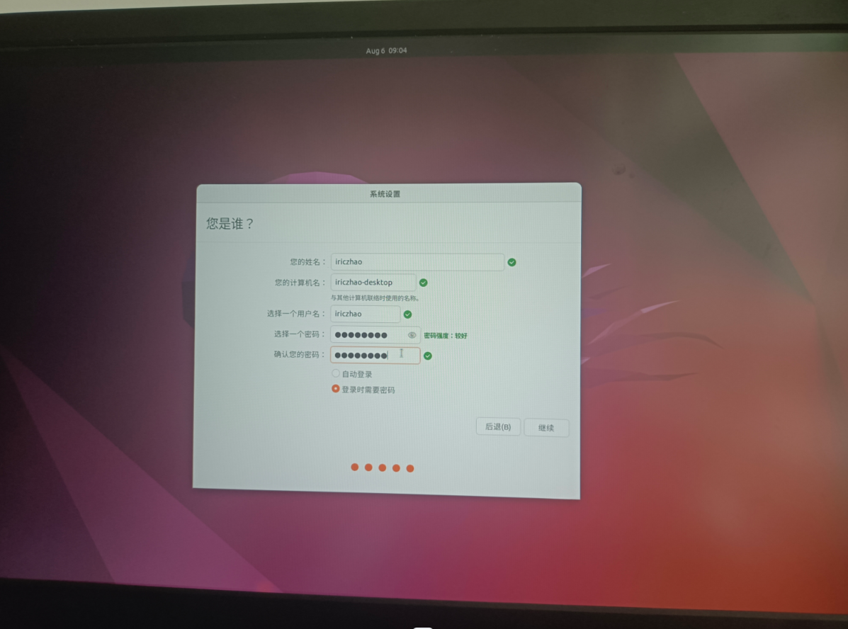 经过一段时间后,ubuntu将安装完成,完成后系统会重启,这时候输入密码即可进入ubuntu的桌面环境: