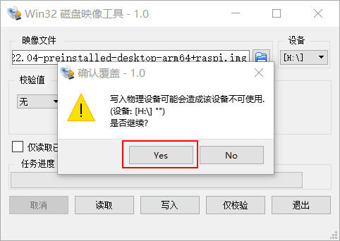 点击“写入”按钮后,可能会弹出警告窗口,点击“Yes”即可(如果MicroSD卡内有重要数据,需要备份一下):