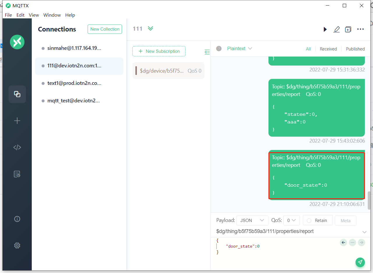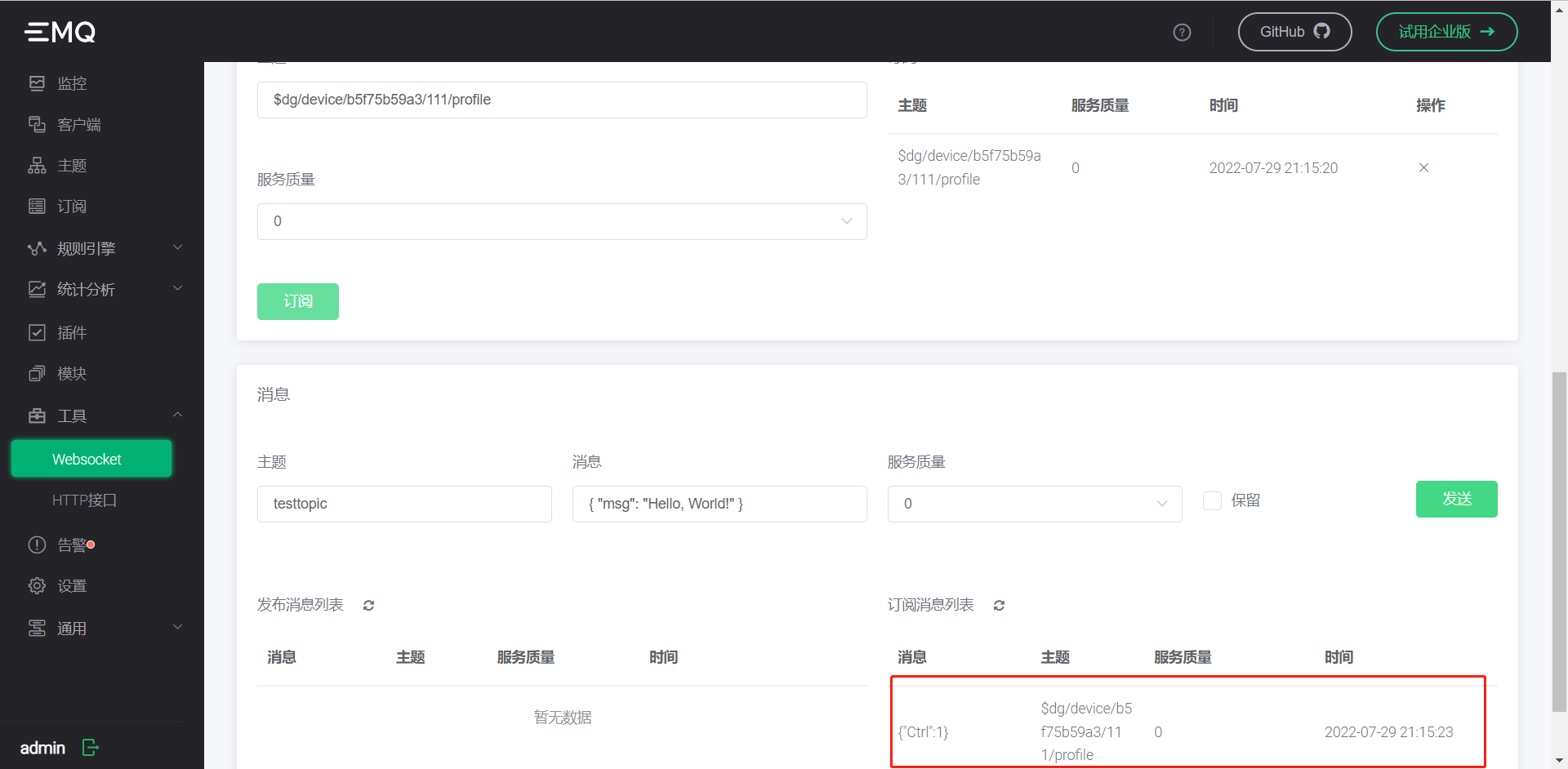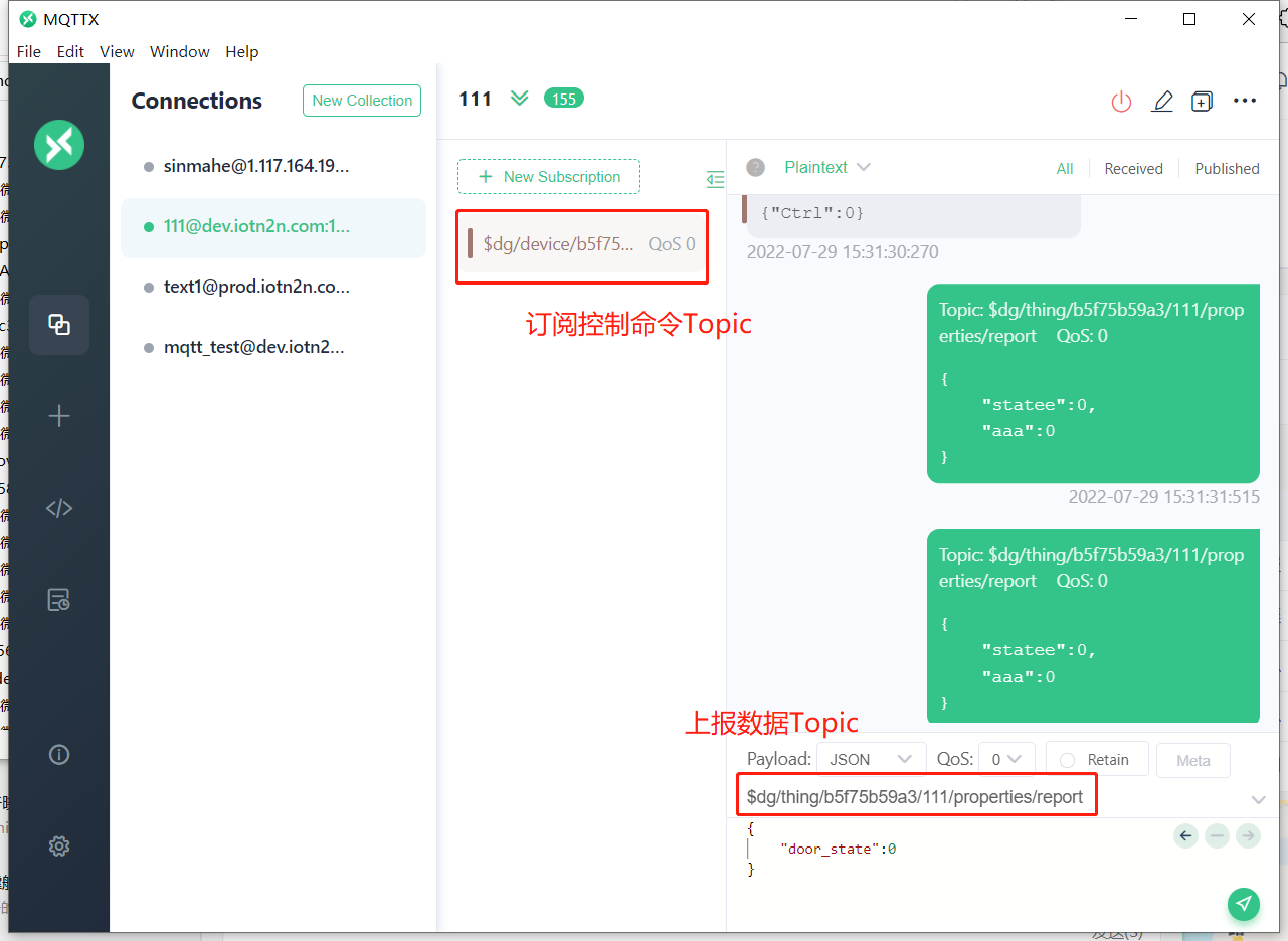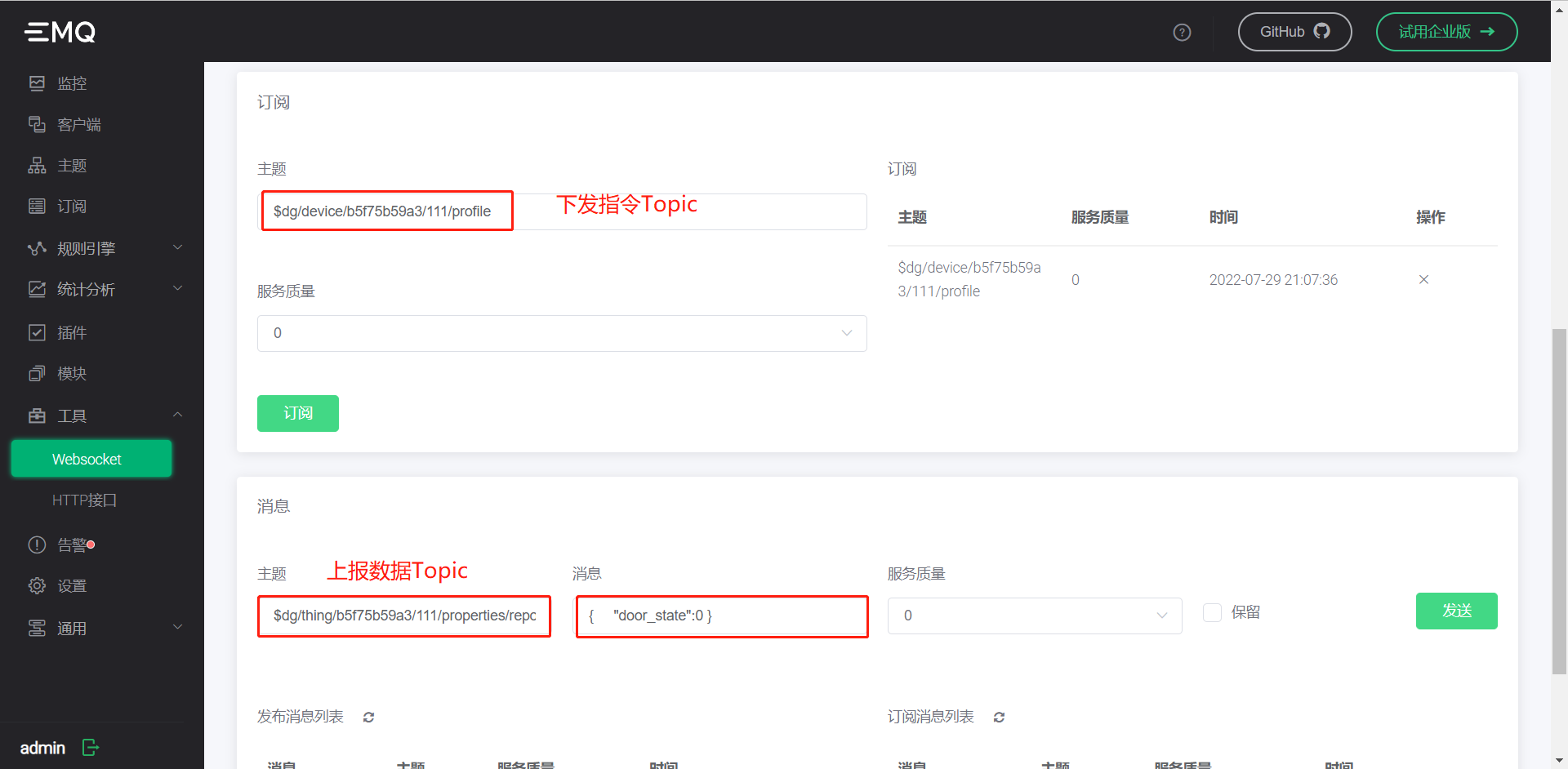 9.设备数据模拟上报,方式一:MQTTX上报;方式二:ip:18083上报