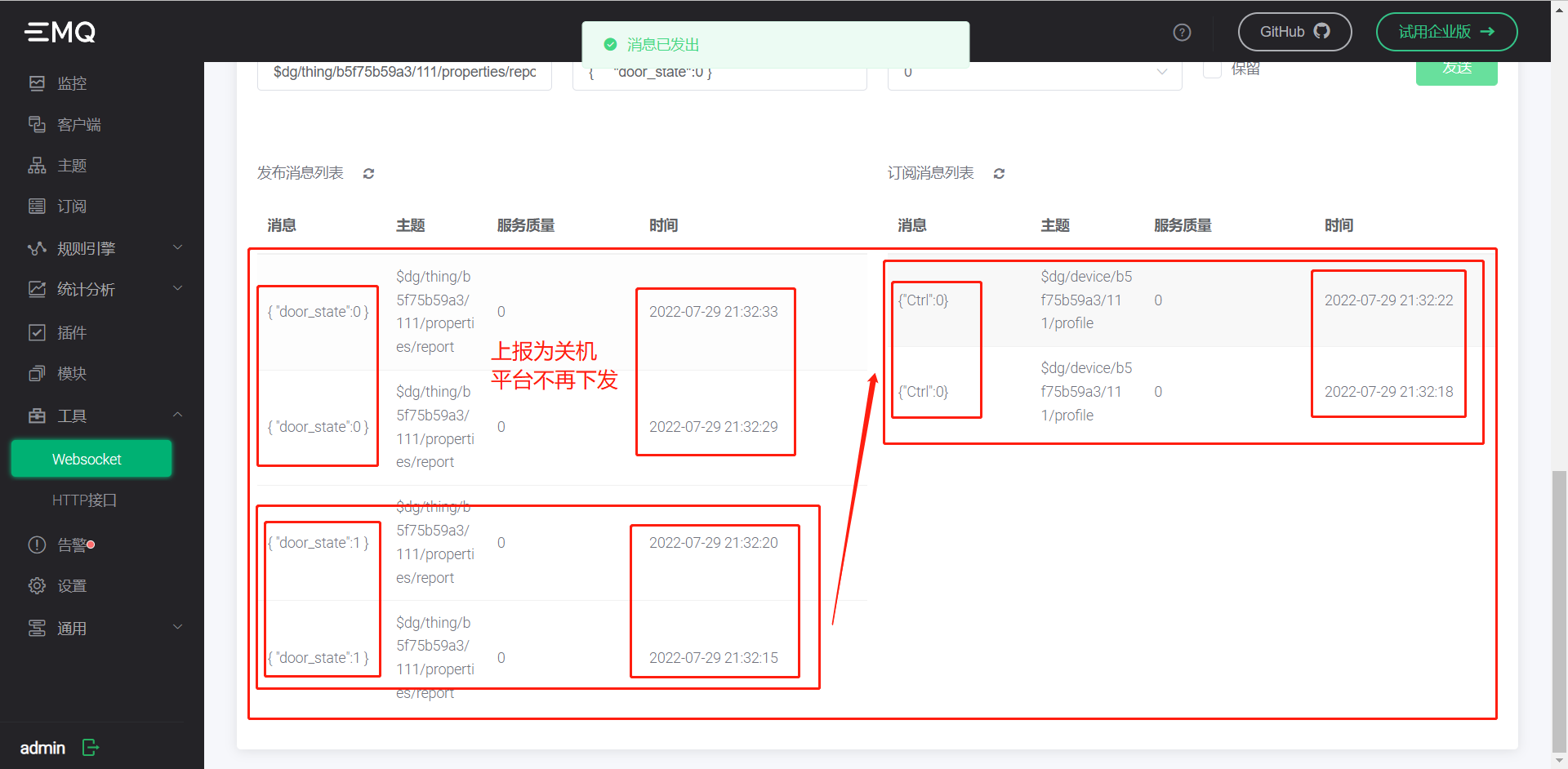 ip:18083模拟上报状态值为1(开机的状态),平台自动下发关机命令,如下图