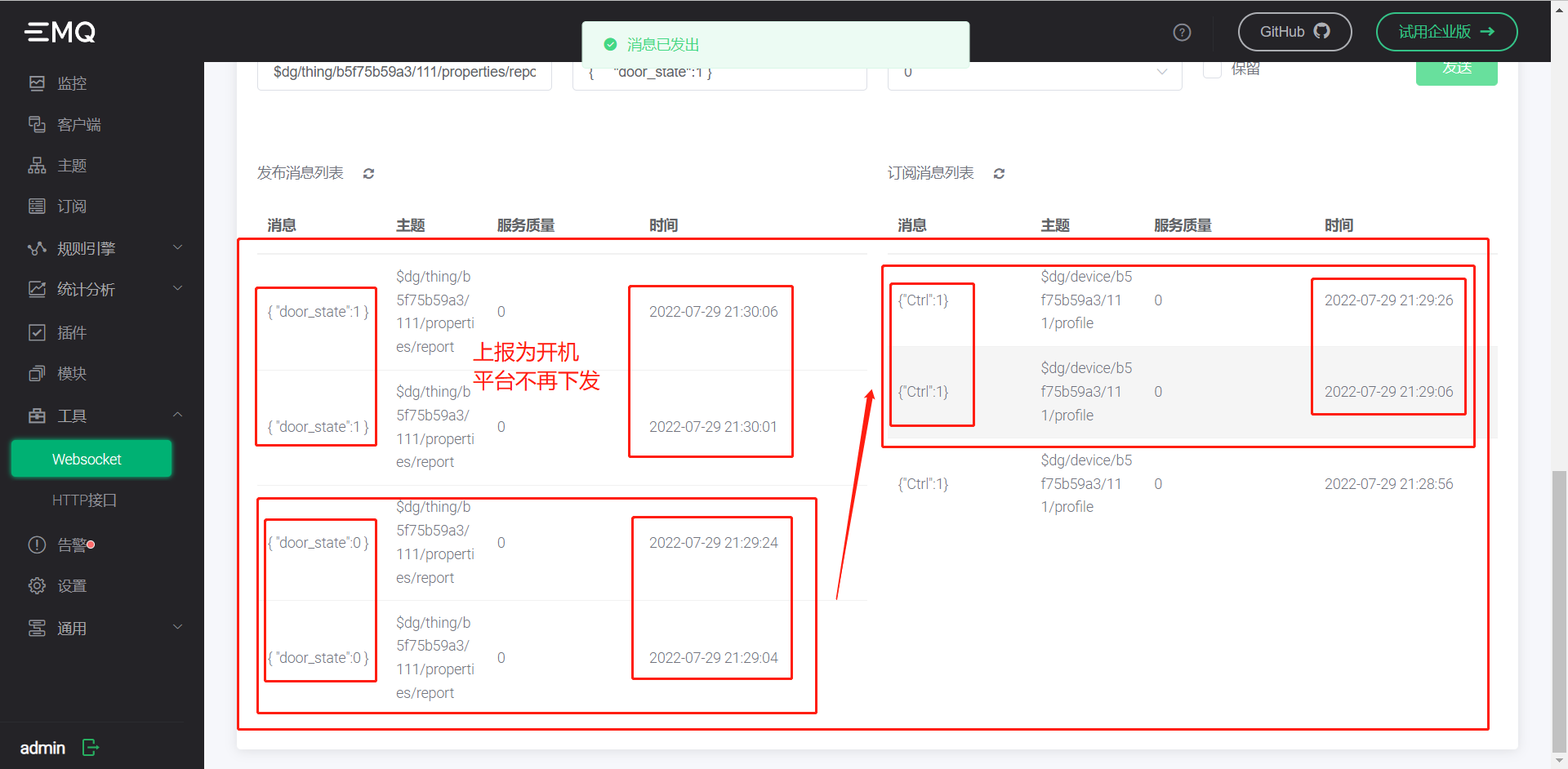 ip:18083模拟上报状态值为0(关机的状态),平台自动下发开机命令,如下图