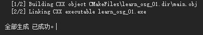 6.点击VS菜单的"生成-全部生成",VS会自动调用相关工具生成"learn_osg_01.exe",F5可运行调试,此时在控制台上已经可以输出"Hello, osg!"。