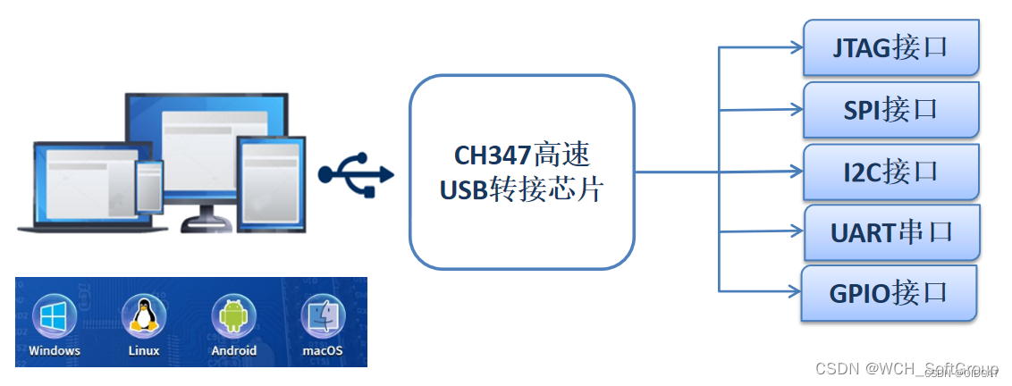 高速USB转接芯片CH347是一款集成480Mbps高速USB接口、JTAG接口、SPI接口、I2C接口、异步UART串口、GPIO接口等多种硬件接口的转换芯片。