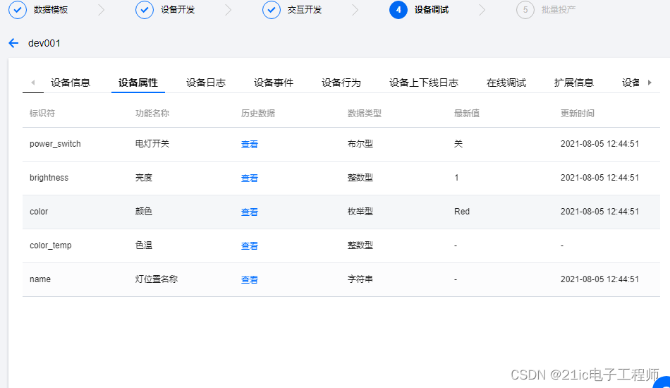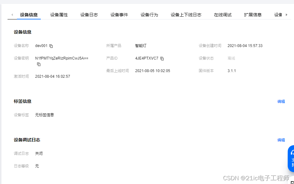 这三个数据信息在产品dev001详情页中,点击蓝色dev001字样便可进入:
