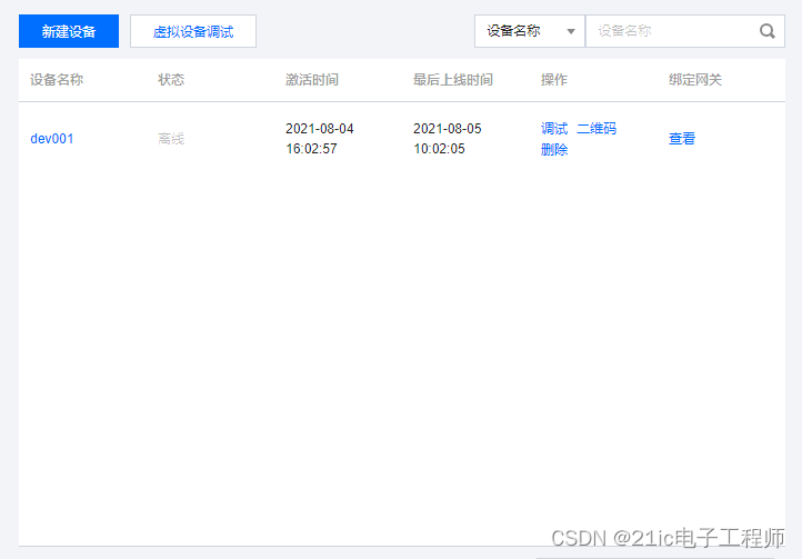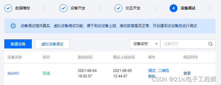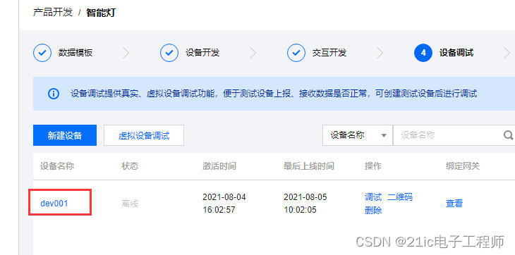 在【设备调试】页面中,单击【新建设备】,设备名为 dev001: