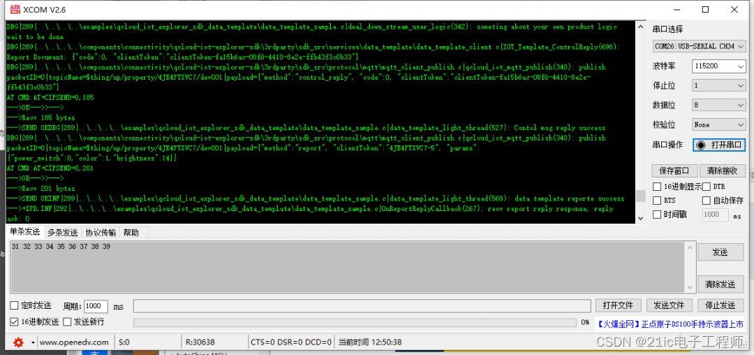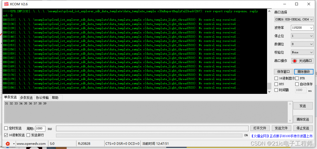右侧通信日志窗口可查看指令的下发与开发板的回应。在串口助手同样可以看到收到的数据: