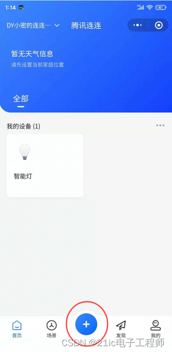 微信搜索“腾讯连连”,打开微信连连小程序,授权后在主页面点击屏幕中间的“+”图标,使用扫一扫 扫描弹出的二维码即可绑定我们的智能灯。
