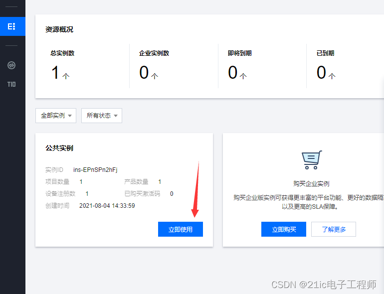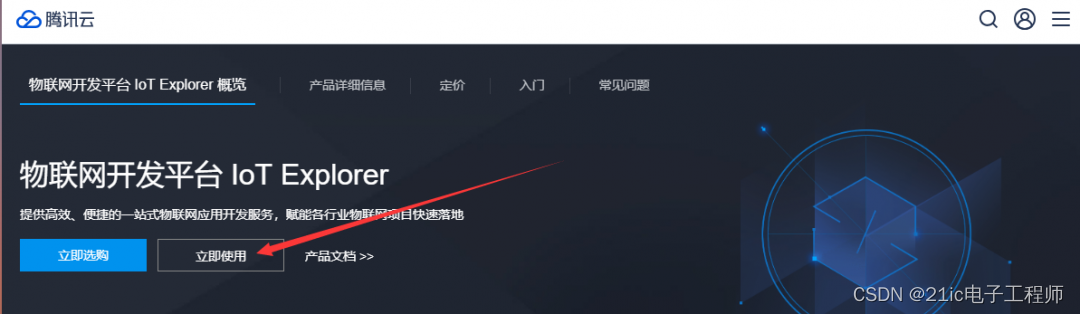 登录腾讯云物联网开发平台,登陆后点击立即使用进入产品开发界面。