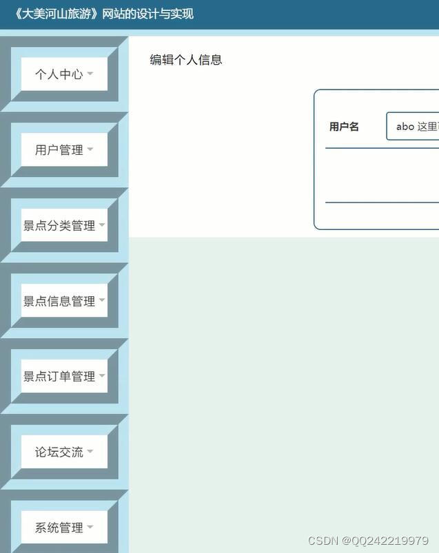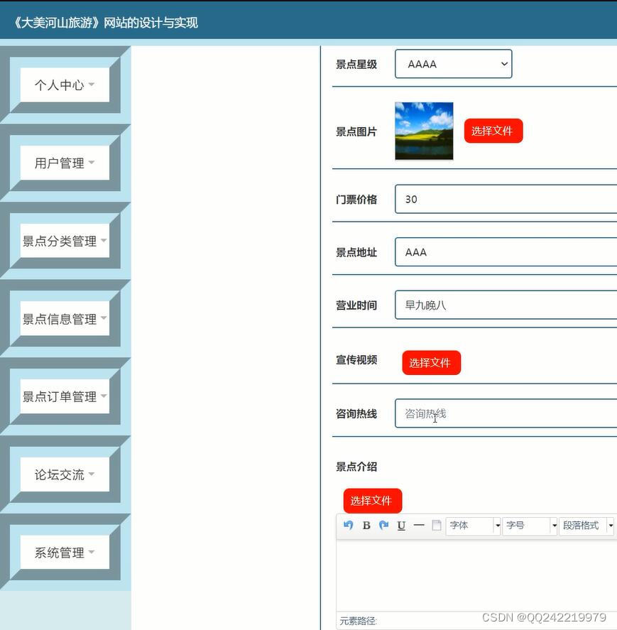 本网站通过介绍大美河山旅游景点信息,更系统的向人们介绍大美河山旅游的风土文化以及各色景点,让大美河山旅游的味道更浓一点,让用户更快速的通过本网站了解大美河山旅游的面貌,同时在本网站的首页用户可以按地方性进行景点的搜索和查询,以达到节约用户的时间,同时在网页的右模块,有提示一些比较热门的旅游景点,用户也可以通过这个模块及时快速的了解相关旅游景点,方便他们参考,同时用户在不登录的情况下,也可以在网页上进行匿名的留言,在登录后,用户可以实现在线预订功能,同时在个人中心中查看预订情况,本网站的前台网页,总体上大方美观,以橙色为主色调,呈现一种舒适简洁的页面供用户浏览,使用户在浏览网页时,减少其疲劳感,在后台,管理员能更新上传景点信息,更加方便用户的出行,从而促进大美河山旅游经济的发展。