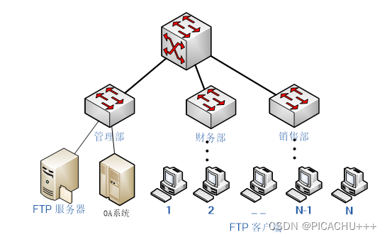 某企业网络拓扑图如下图所示,该企业想构建一台FTP服务器,为企业局域网中的计算机提供文件传送任务,为财务部门、销售部门和OA系统提供异地数据备份。要求能够对 FTP 服务器设置连接限制、日志记录、消息、验证客户端身份等属性,并能创建用户隔离的FTP站点。