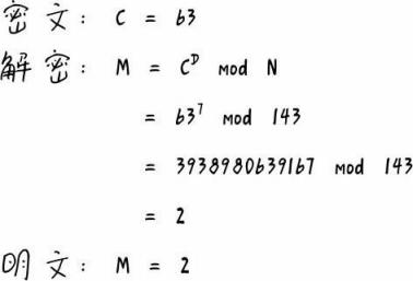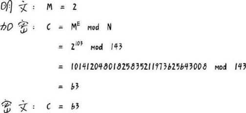 有了公钥,就可方便地进行数据加密了。在上面这个例子中的公钥为 (143 ,7) ,私 钥为 (143 ,103) ,由于是手工计算,为了使计算的数据量小一点,因此将公钥与私钥进 行交换,即公钥使用 (143 ,103) ,而私钥则使用 (143 ,7) 。设明文为2 ,则加密过程 如下: