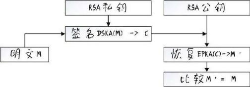 因为除A外没有别人能具有A的私密密钥SKA ,所以除A外没有别人能产生密文 DSKA (M) 。这样,报文M就被签名了。用私钥加密后的密文发送给对方,对方只能用 持有的公钥进行解密,以实现核实发送者对报文的签名。
