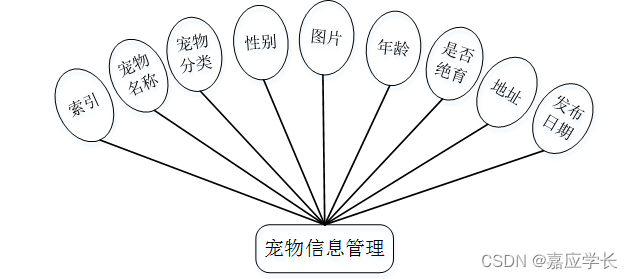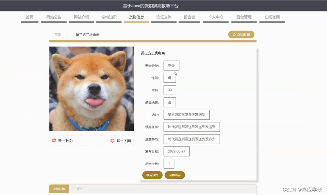 宠物信息,在宠物信息页面可以查看宠物名称,宠物分类,图片,性别,年龄,是否绝育,地址,领养条件,注意事项,发布日期,点击次数,宠物详情等内容;还可以进行收养预约,宠物领养,评论和收藏等操作;如图5-3所示。
