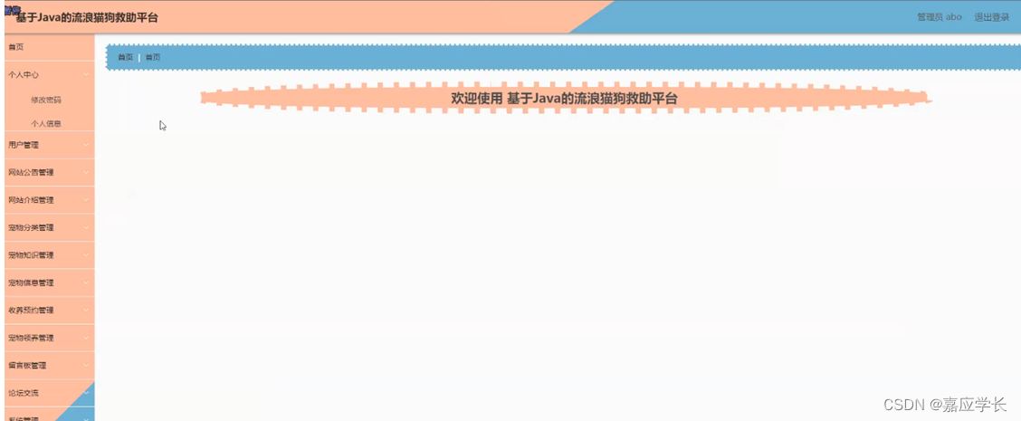 管理员登录系统后,可以对首页,个人中心,用户管理,网站公告管理,网站介绍管理,宠物分类管理,宠物知识管理,宠物信息管理,收养预约管理,宠物领养管理,留言板管理,论坛交流,系统管理等功能进行相应的操作管理,如图5-5所示。