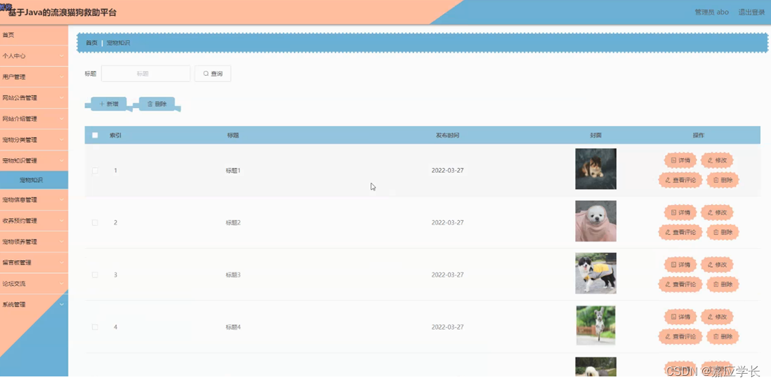 宠物知识管理,在宠物知识管理页面可以对索引,标题,发布时间,封面等内容进行详情,修改,查看评论或删除等操作,如图5-9所示。