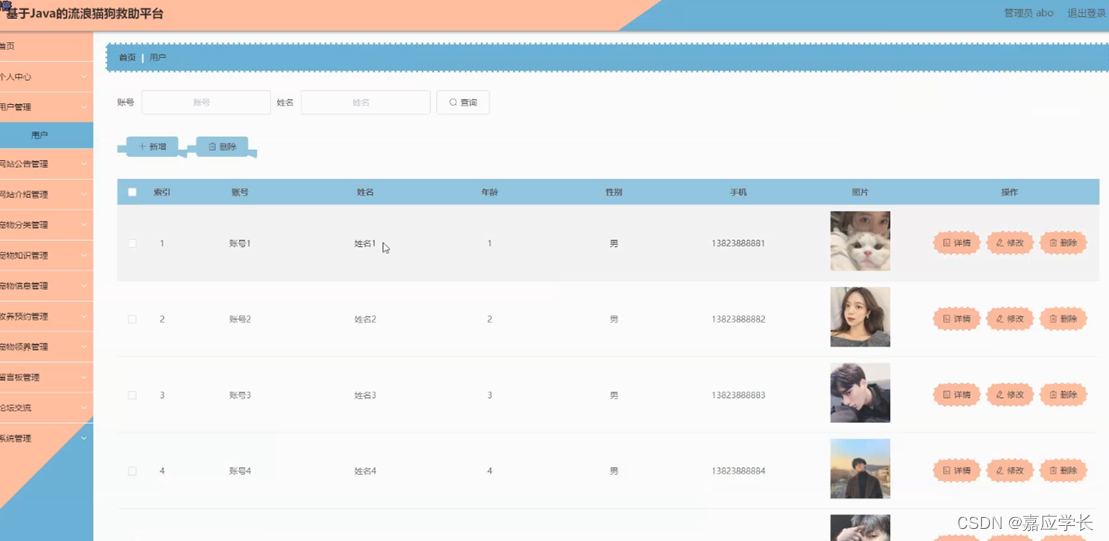 用户管理,在用户管理页面可以对索引,账号,姓名,年龄,性别,手机,图片等内容进行详情,修改或删除等操作,如图5-6所示。