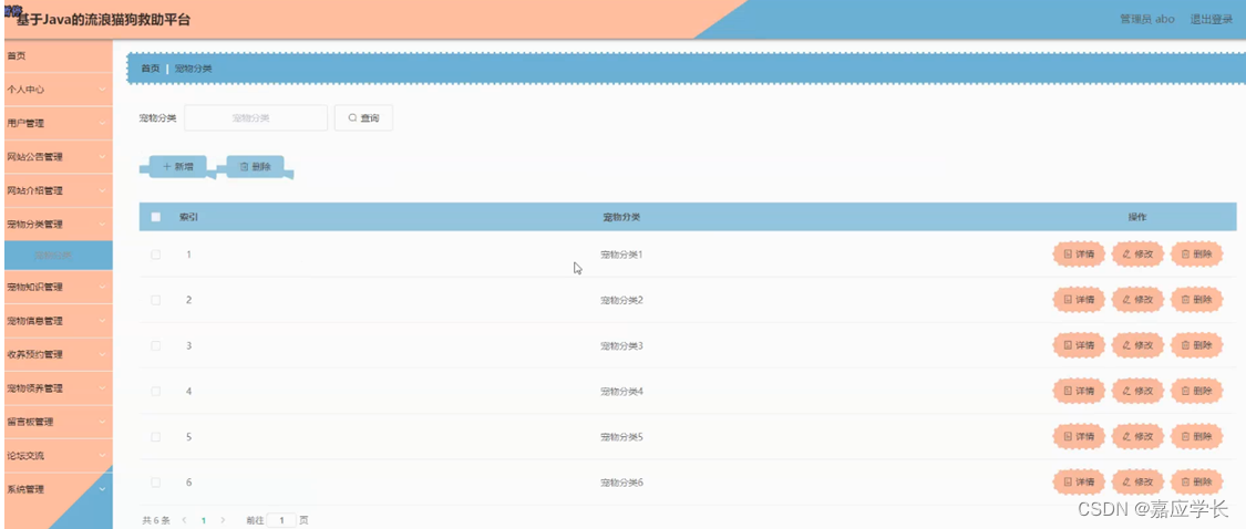 宠物分类管理,在宠物分类管理页面可以对索引,宠物分类等内容进行详情,修改或删除等操作,如图5-8所示。