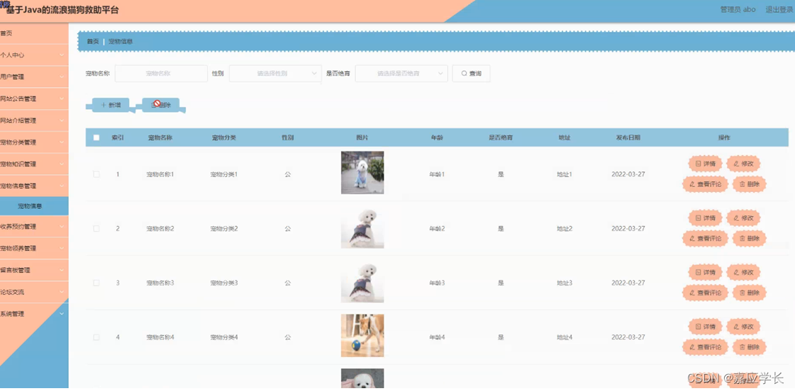 宠物信息管理,在宠物信息管理页面可以对索引,宠物名称,宠物分类,性别,图片,年龄,是否绝育,地址,发布日期等内容进行详情,修改,查看评论或删除等操作,如图5-10所示。