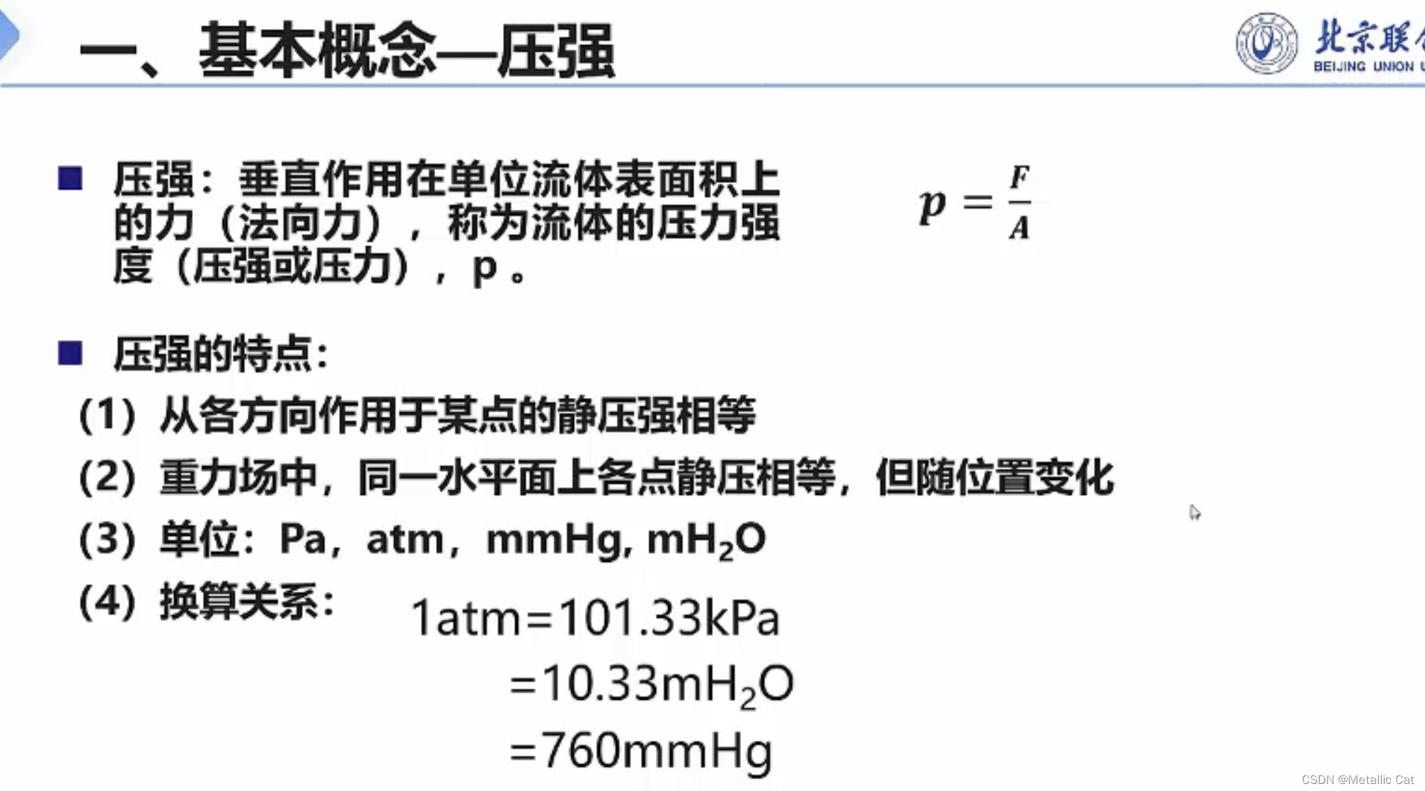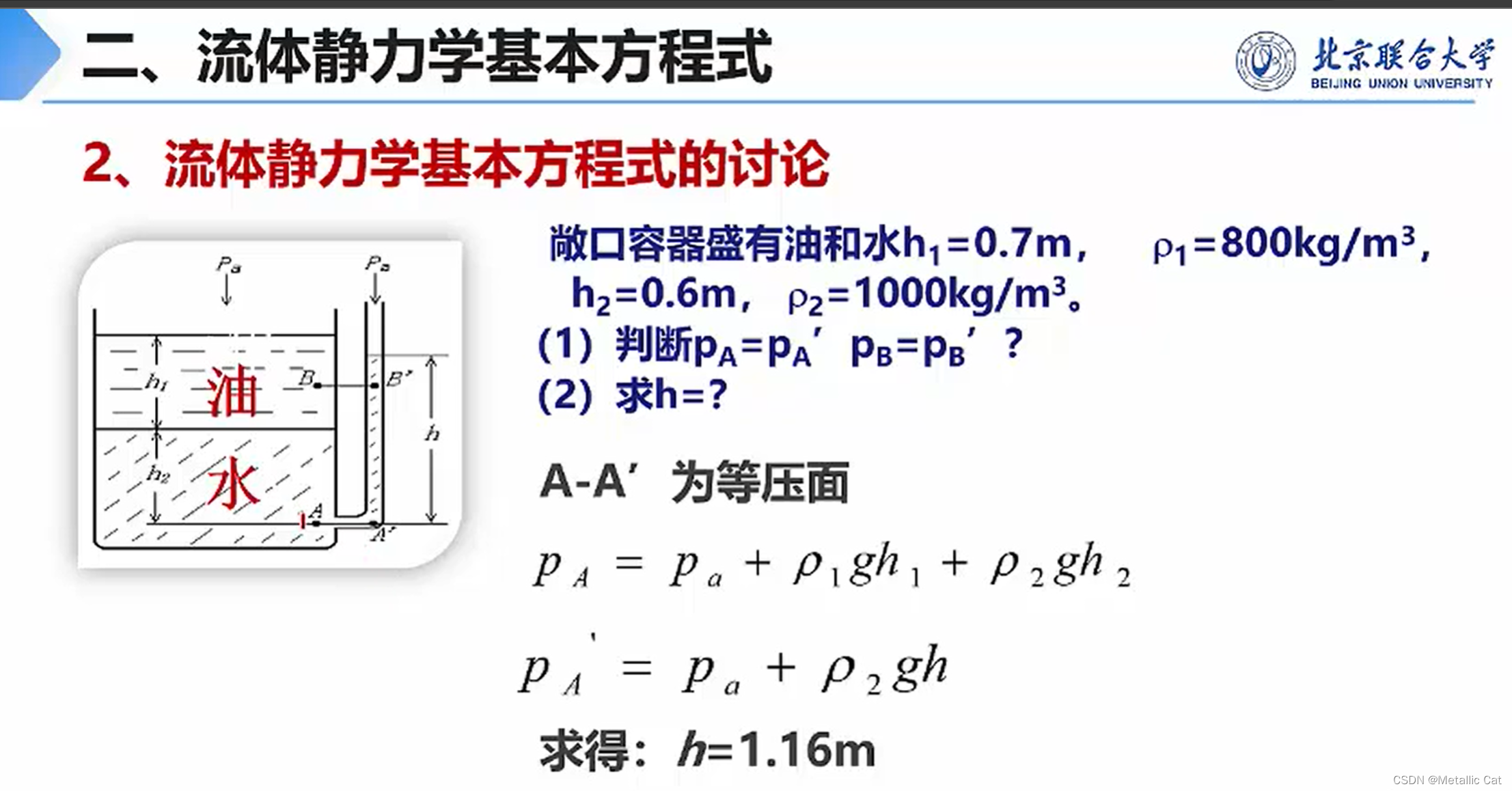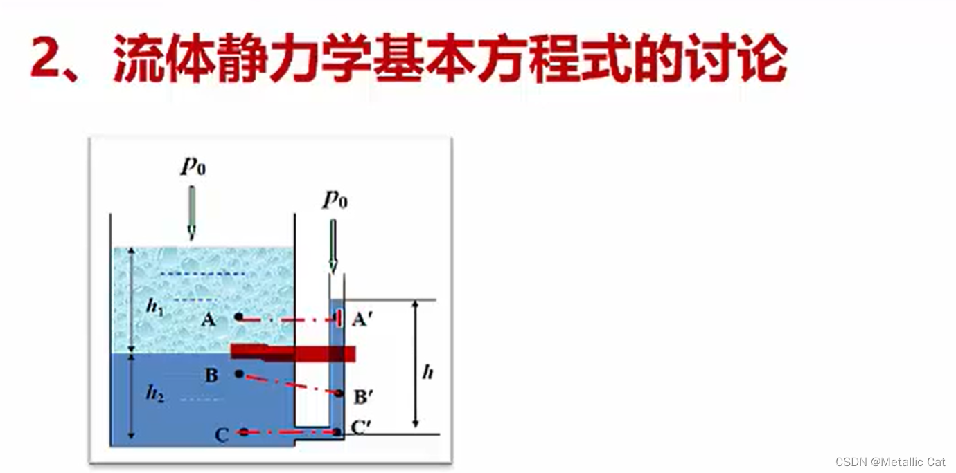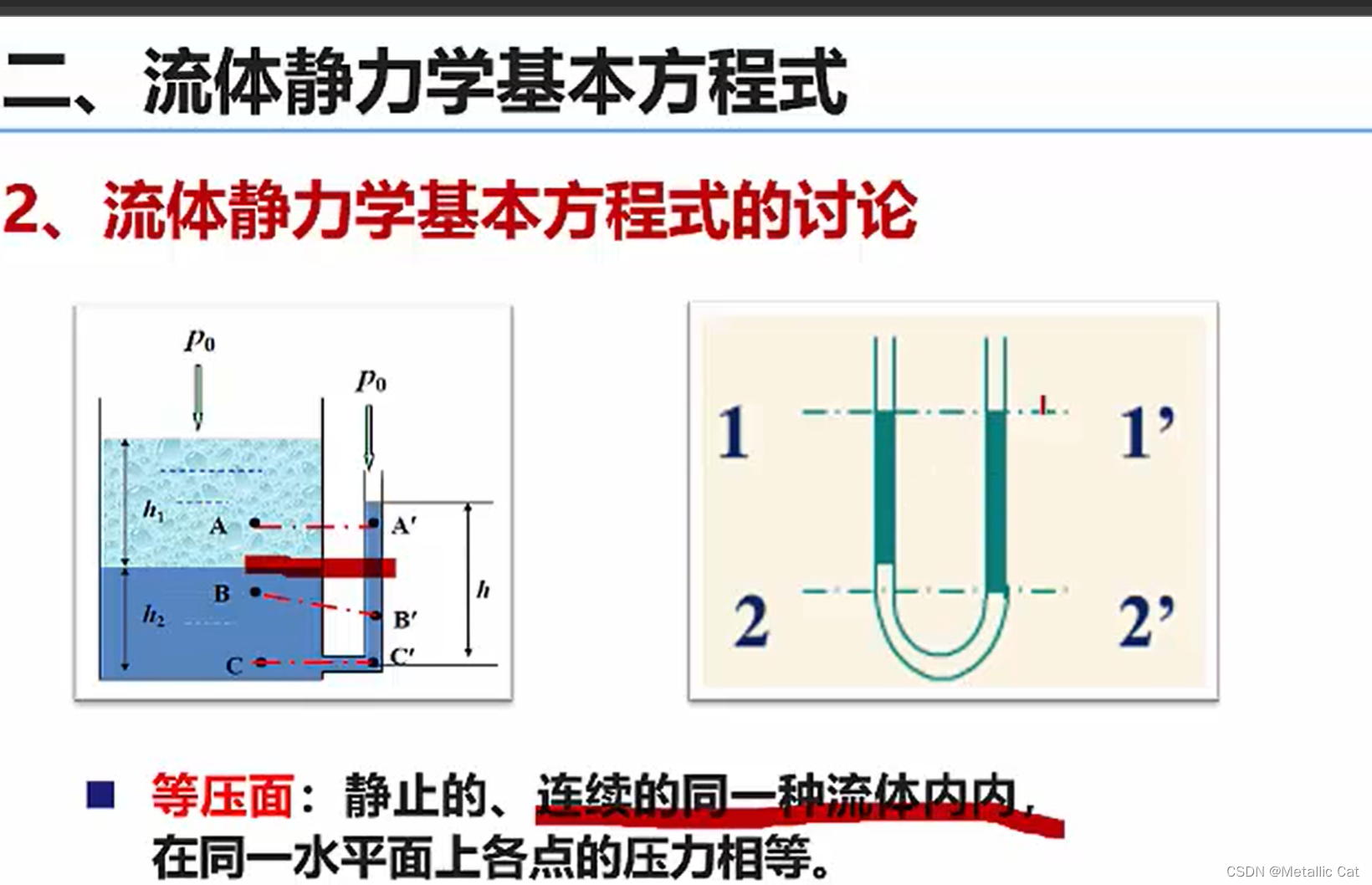 1.在密度相同的流体中,处于同一平面上的各点压强相等(CC'),反之则不相等(BB')
