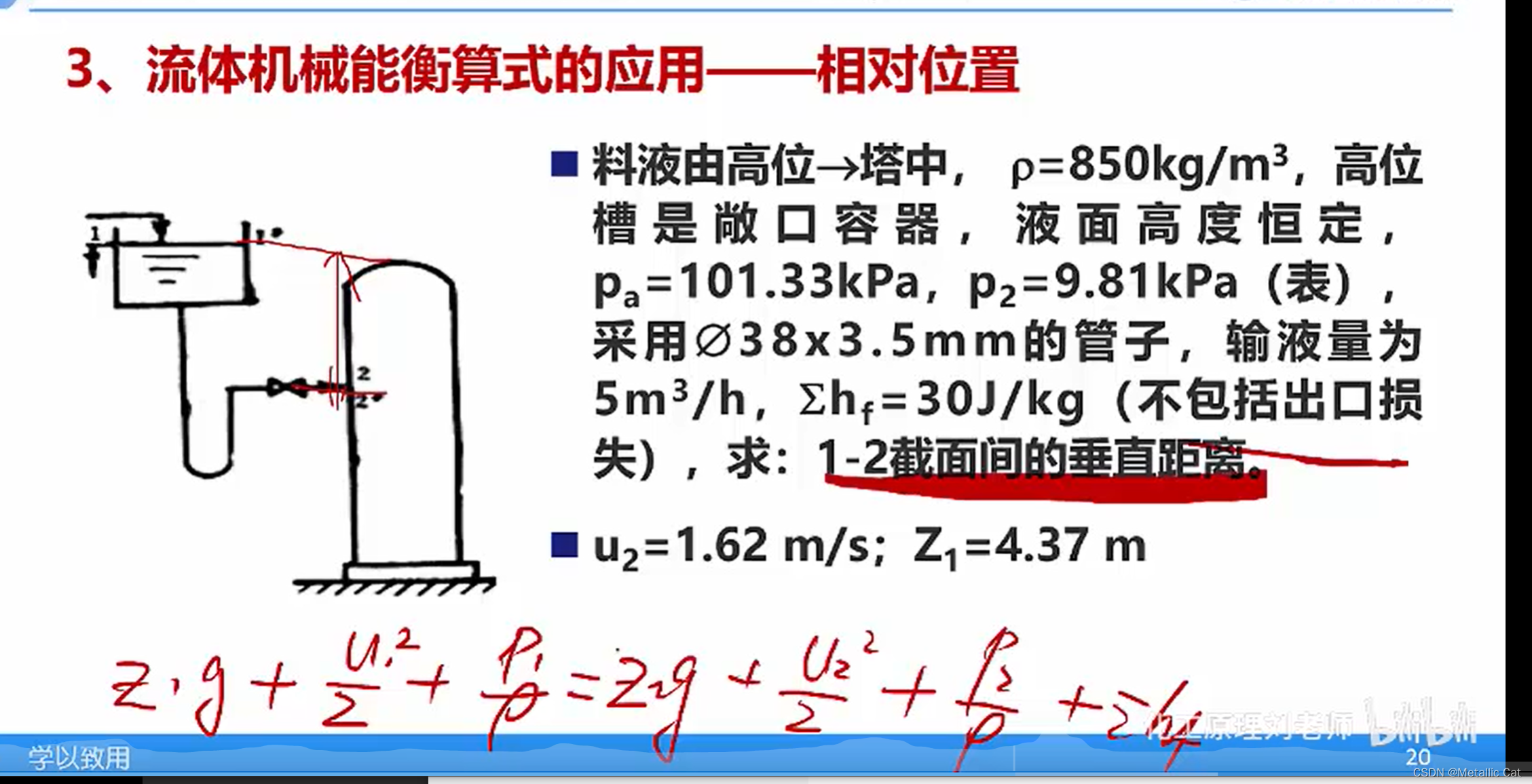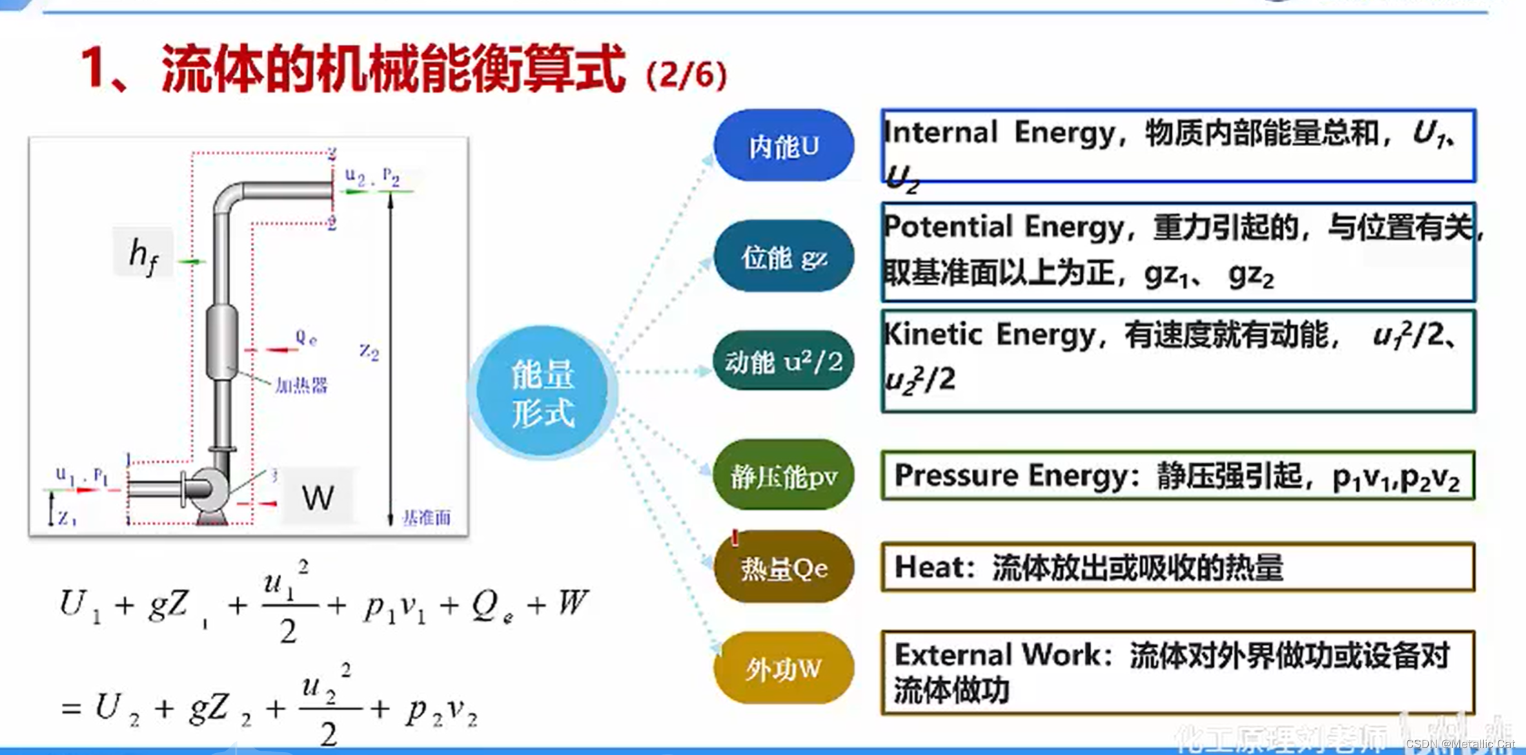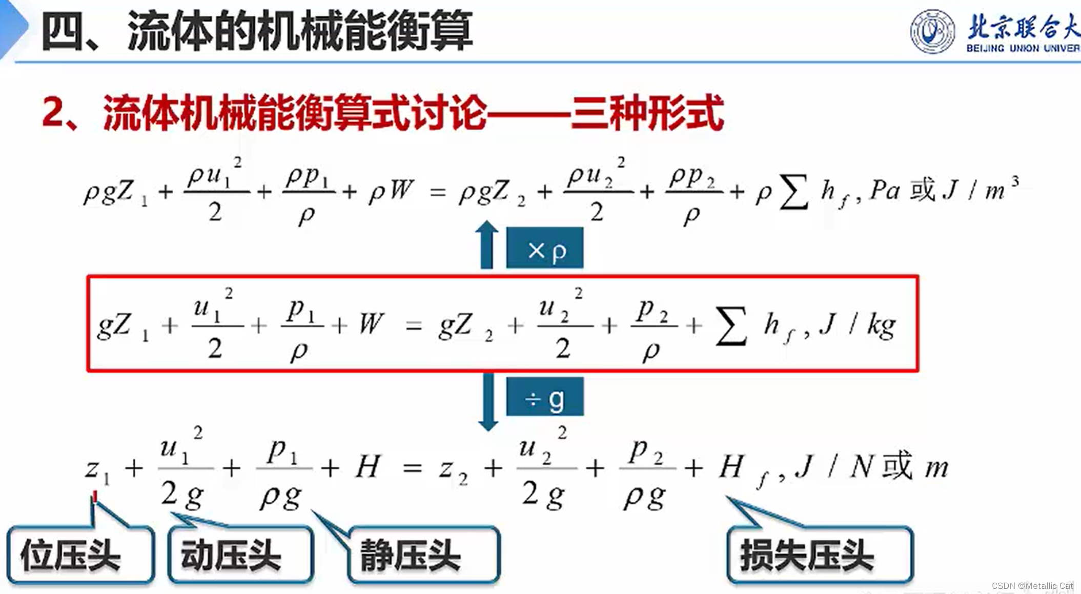 通过这个式子我们就能够看出之所以要有1,2两个截面之间的垂直距离(重力势能差)是为了将重力势能差转变为流体的动能,静压能以及摩擦损耗的内能