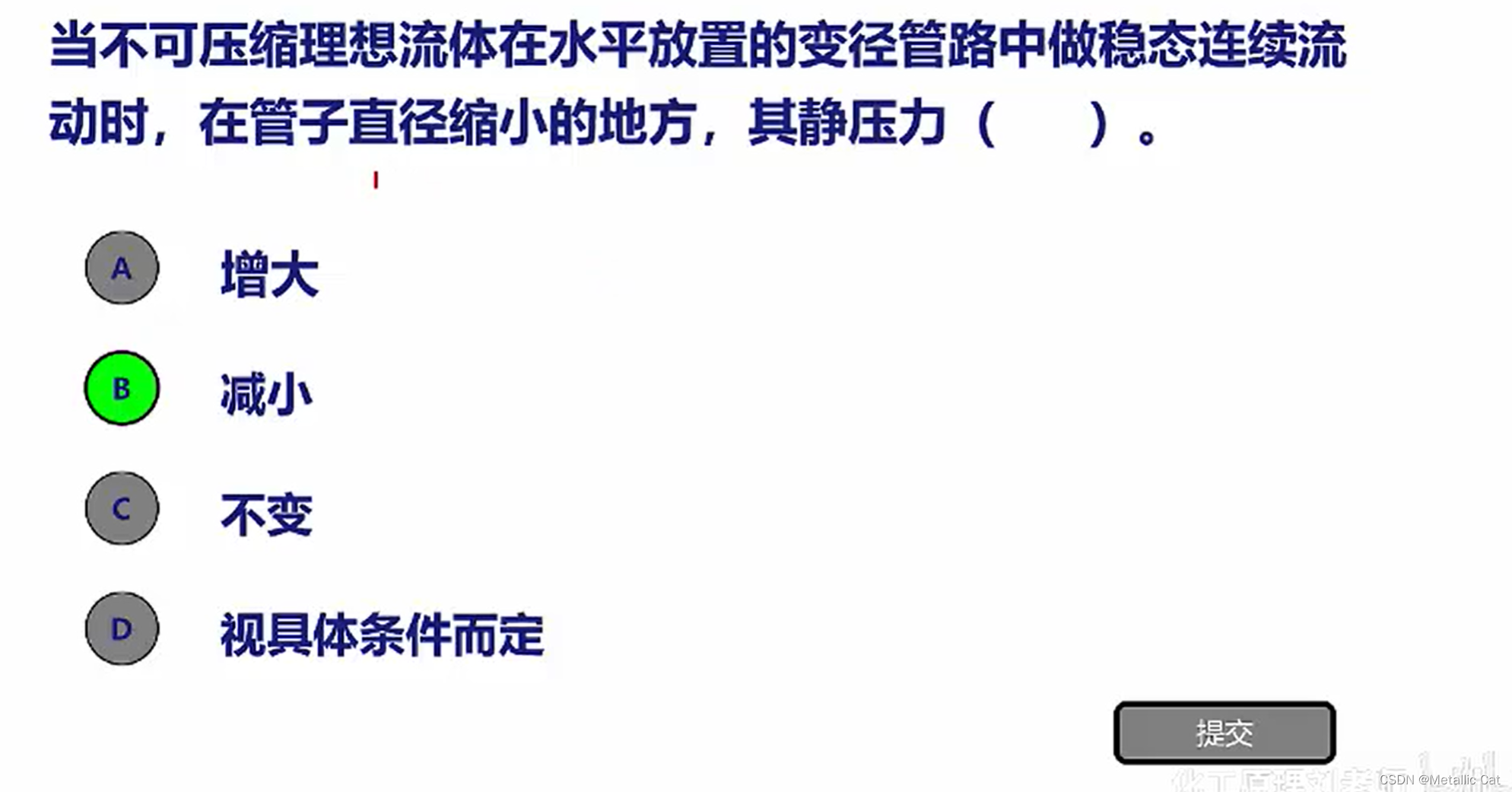 直径缩小,根据前面的所学可知此时流速增大,动能增大,根据机械能守恒可知静压能降低 --- 又体积不变,所以静压力降低