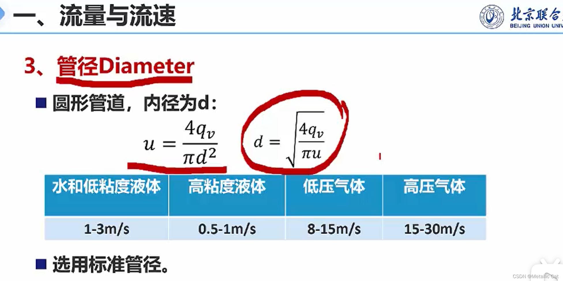 1.根据给定的速度代入公式求出钢管的内径长,然后根据这个内径长在标准管径中选择管径(要求我们选择的钢管的内径长小于或等于我们上面求得的内径长)
