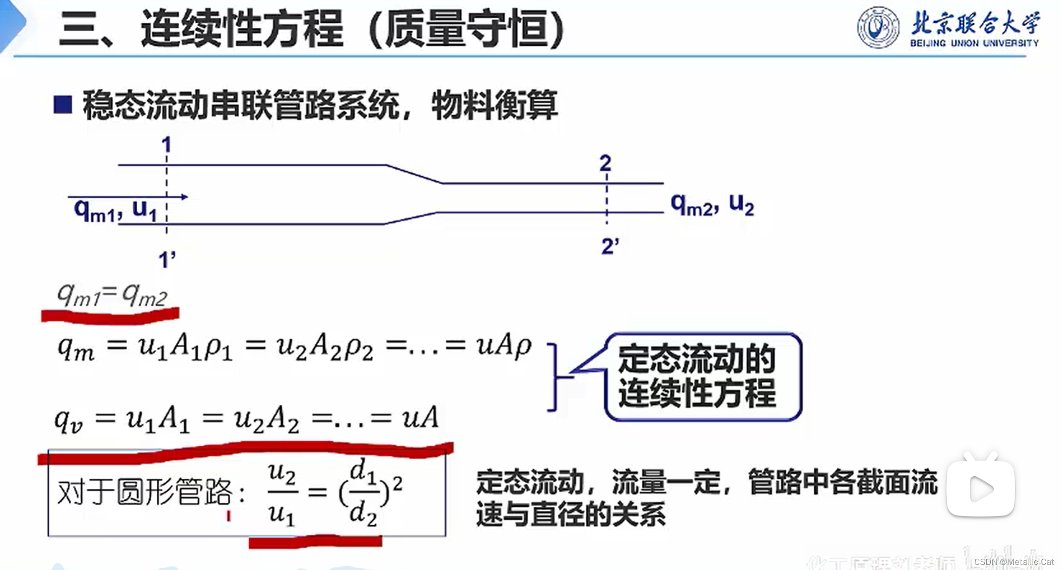 1.在稳定连续流动系统中,无论是可压缩流体还是不可压缩流体,它们的质量流量在任一截面处都相等,但是体积流量在任一截面都相等只对于不可压缩流体适用