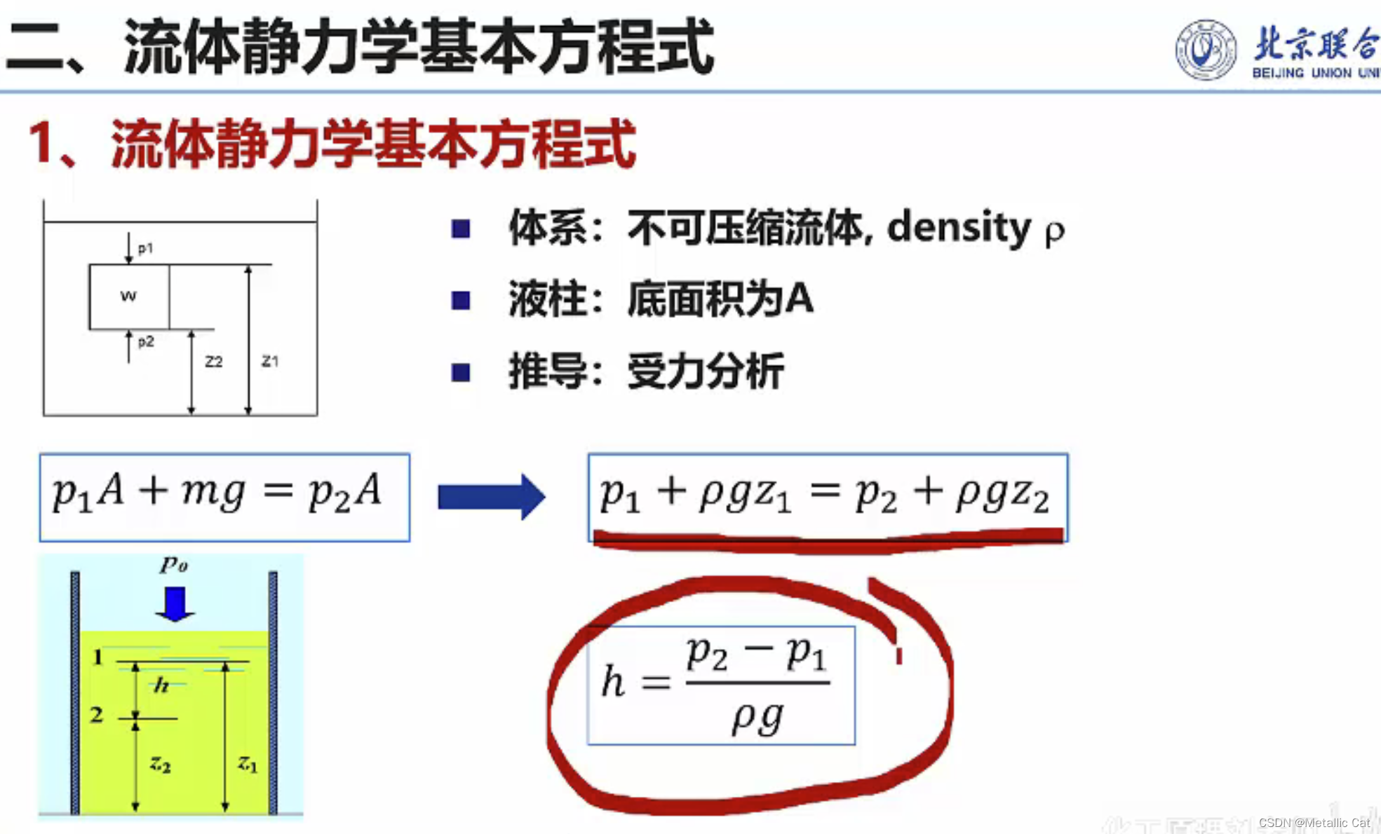 3.红圈圈起来的公式表示的是在一个静止的流体体系中,任意两个截面之间的压差(下截面压力减去上截面压力)与两个截面之间的距离h成正比的关系