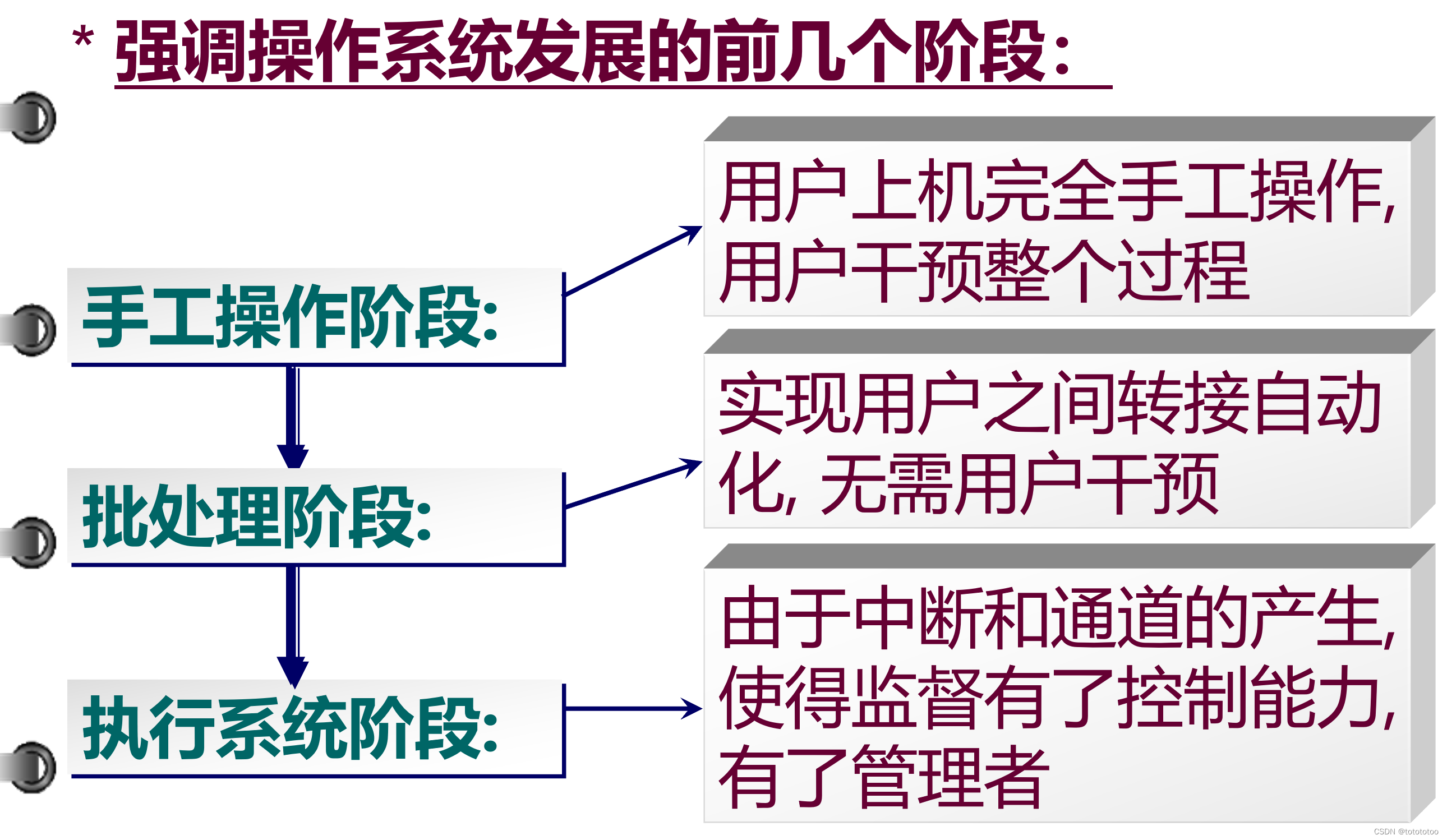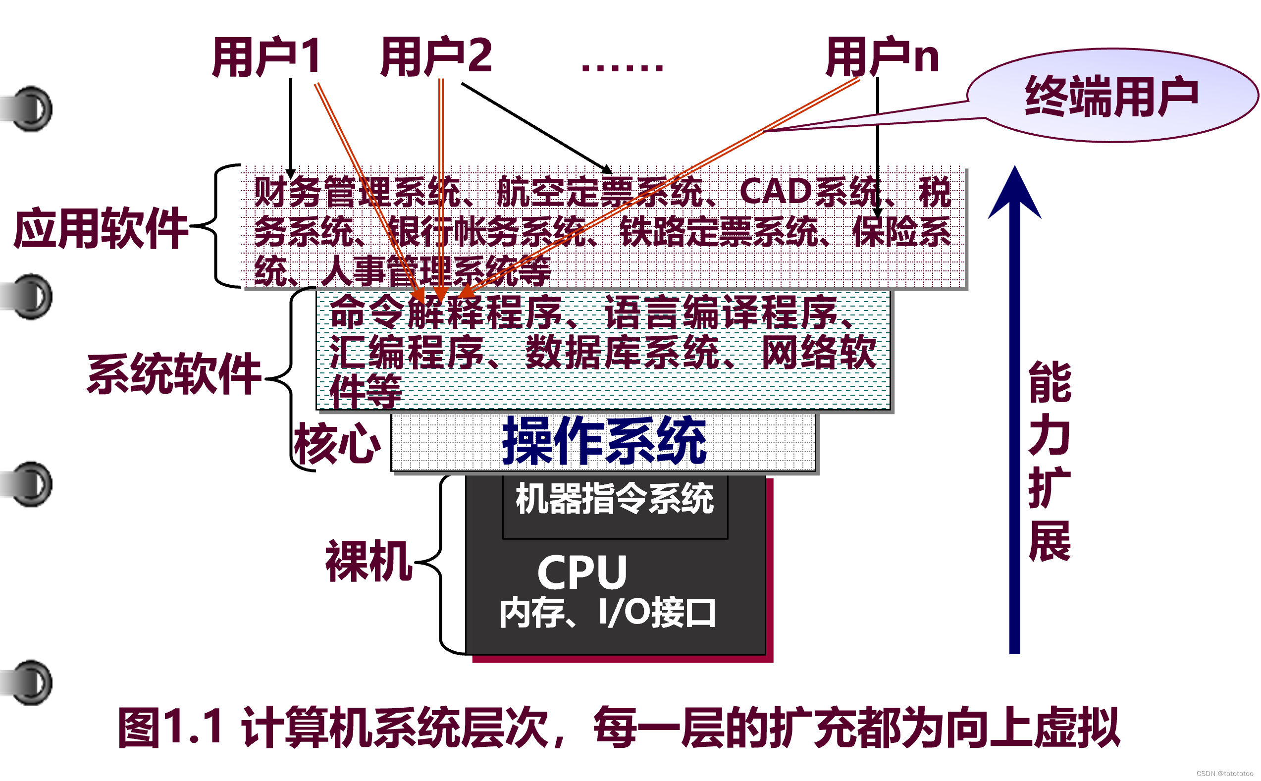- 因为要是只借助CPU,那么能使用的只有机器语言,能运行的只有 二进制代码。而有了以操作系统为核心的系统软件之后,就可以扩展CPU裸机的能力,让多个应用软件(用户)得以依托系统软件的程序存在