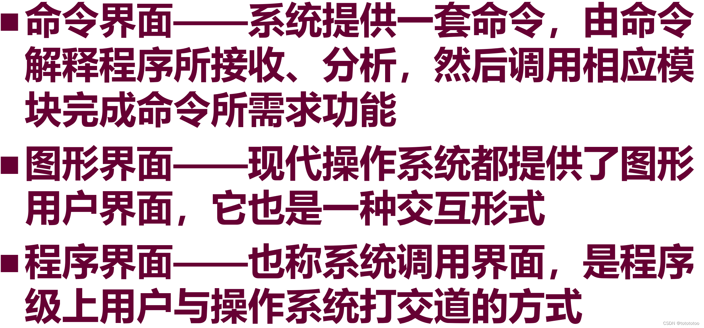 - 为支持交互,又很快就产生了分时系统等不同类型的操作系统