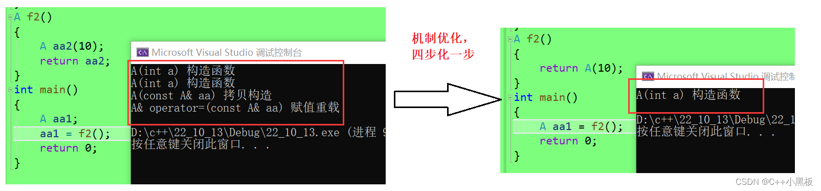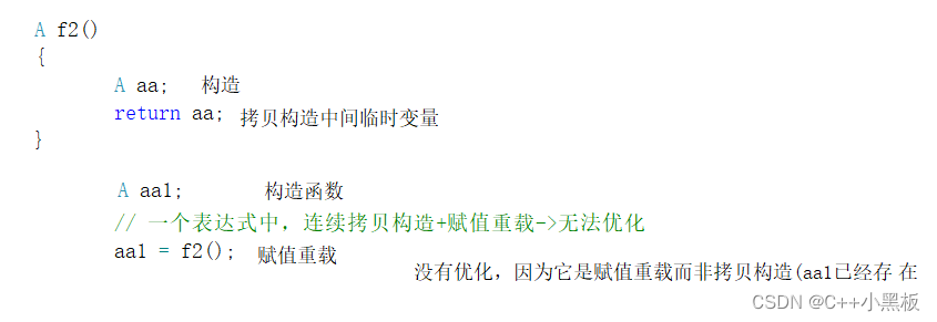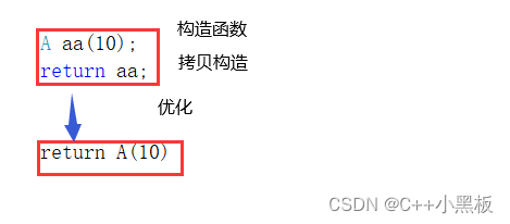 编译器优化的前提是不影响正确性。前面的优化是因为中间临时变量创建了也没用,因为创建了它再拷贝构造,然后销毁,不如直接拷贝构造。