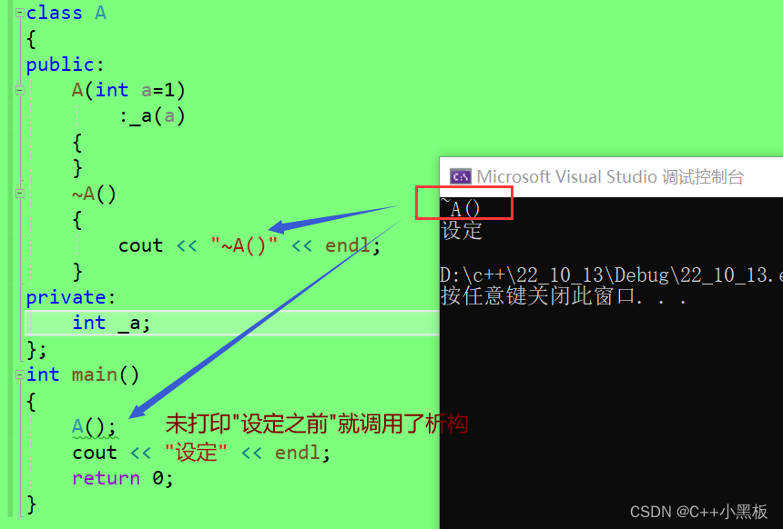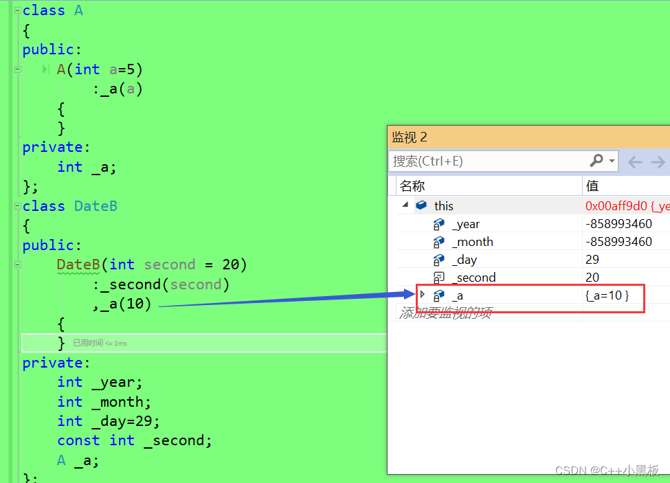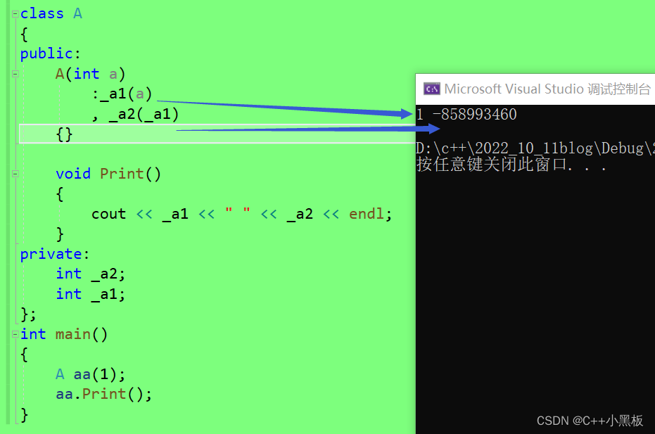 尽管在初始化列表中,我们的次序意思是先初始化_a1,再初始化_a2, 然而结果好像并非如此,按照我们的感觉,结果应该是1,1.出现这样的结果说明编译器并非按照我们所设定的顺序,而是按照在类中声明的次序,先初始化_a2,再初始化_a1,因为_a1刚开始是随机值,所以_a2也是随机值,然后_a1初始化为1.