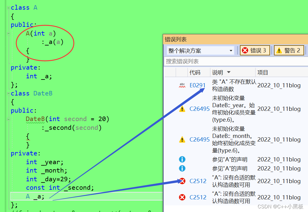 这里自定义类型A就没有它的默认构造函数,所以会报错,我们再来回顾一下什么叫默认构造函数:没有参数,或者有带缺省的参数的构造函数就是默认构造函数,对于需要传参,不给缺省的就不是。