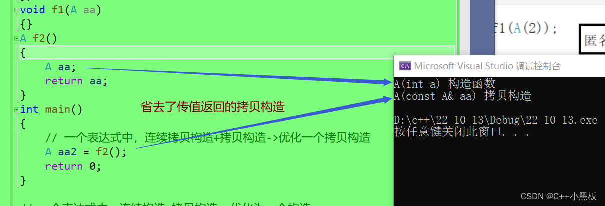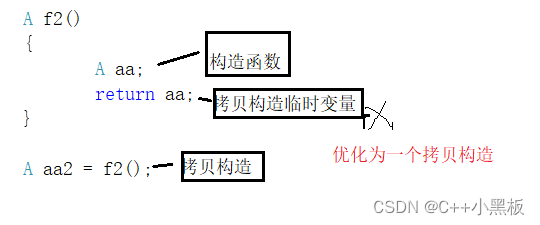 传值返回,因为出栈会销毁栈中变量,所以需要拷贝构造中间临时变量,然后再拷贝构造给aa2,但是这里优化只调用了一次拷贝构造。