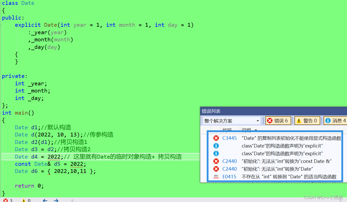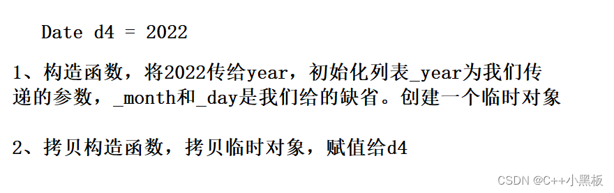Date d4 = 2022;// 这里就有Date的临时对象构造+ 拷贝构造 const Date& d5 = 2022;这里的d4的构造过程是: