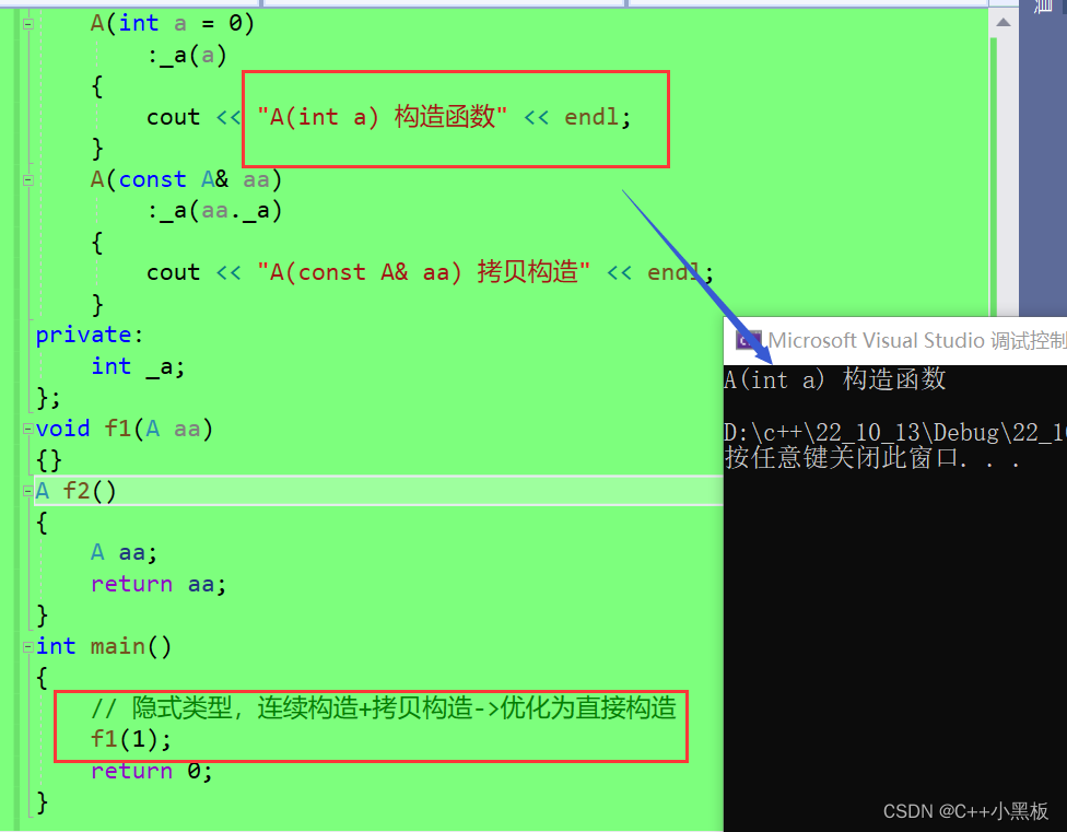 class Date { public: Date(int year = 1, int month = 1, int day = 1) :_year(year) ,_month(month) ,_day(day) { } private: int _year; int _month; int _day; }; int main() { Date d1;//默认构造 Date d(2022, 10, 13);//传参构造 Date d2(d1);//拷贝构造1 Date d3 = d2;//拷贝构造2 return 0; }这里我们还有一种隐式类型转换的方式进行构造: