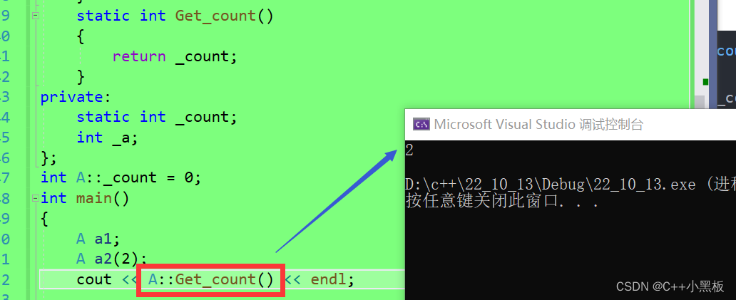 我想得到创建了几个对象,怎么访问到_count呢?我们可以在类里面写一个static函数,得到_count。