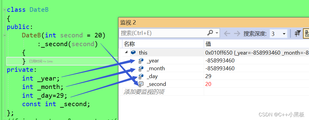 我用初始化列表初始化const修饰的成员_second,构造函数体赋值其他成员。这里我初始化列表_year,之后在构造函数体内又对它赋值,那么_year最后是初始化列表的值还是构造函数体内赋的值呢?答案肯定是构造函数体赋的值,因为初始化列表先给初值,然后构造函数又赋值,初始化列表先于构造。