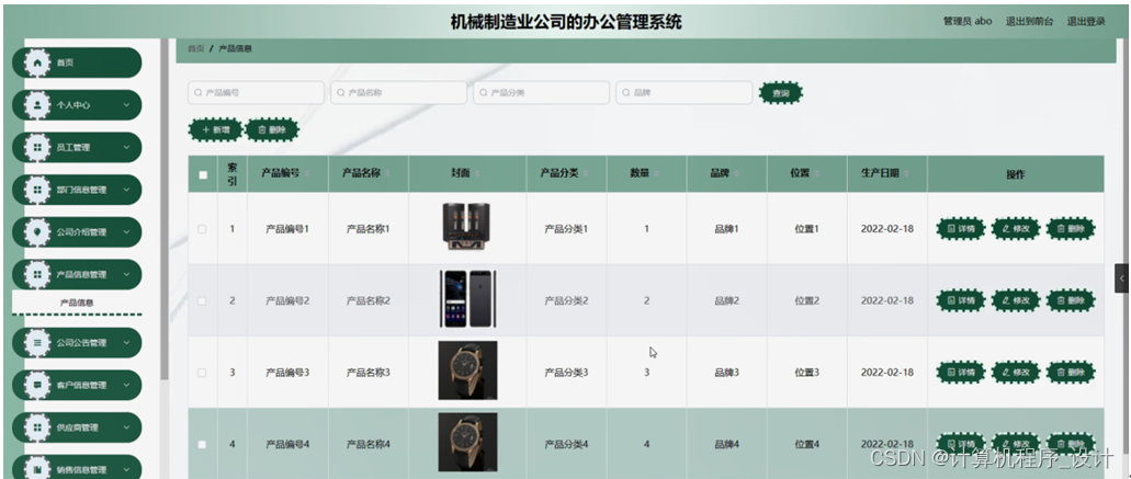 产品信息管理,在产品信息管理页面可以对索引,产品编号,产品名称,封面,产品分类,数量,品牌,位置,生产日期等内容进行详情,修改或删除等操作,如图5-7所示。