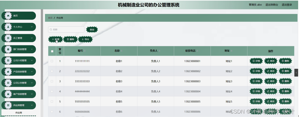 供应商管理,在供应商管理页面可以对索引,编号,名称,负责人,联系电话,地址等内容进行详情、修改或删除等操作,如图5-9所示。