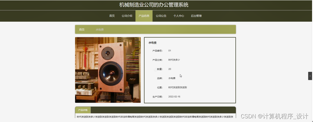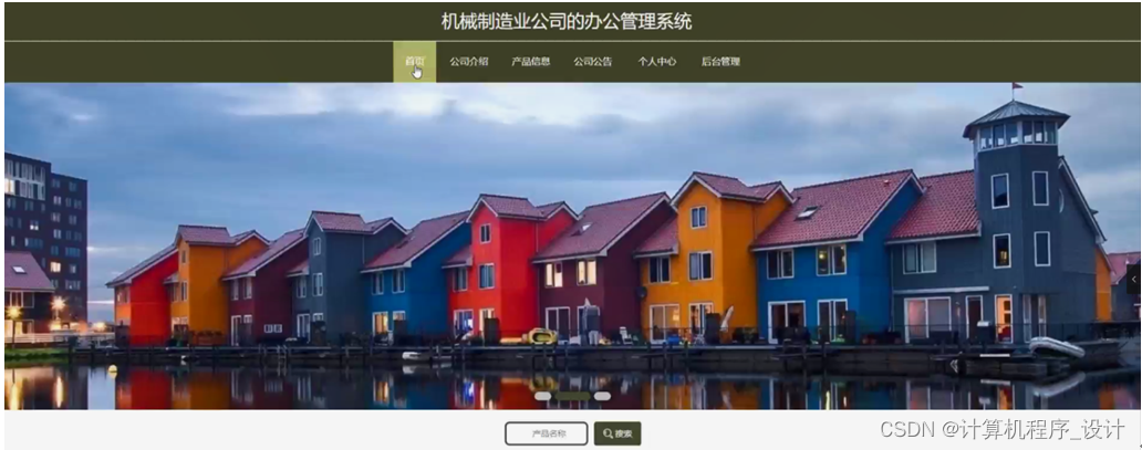 机械制造业公司的办公管理系统,在系统首页可以查看首页,公司介绍,产品信息,公司公告,个人中心,后台管理等内容进行详细操作,如图5-1所示。