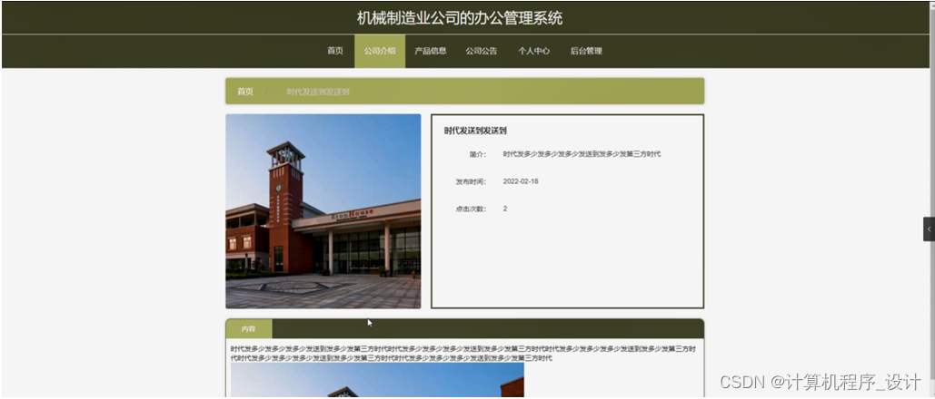 公司介绍,在公司介绍页面可以查看标题,简介,图片,发布时间,内容等内容,如图5-2所示。