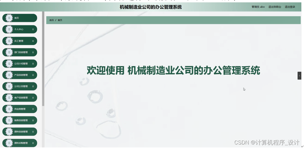 管理员登录进入机械制造业公司的办公管理系统可以查看首页,个人中心,员工管理,部门信息管理,公司介绍管理,产品信息管理,公司公告管理,客户信息管理,供应商管理,销售信息管理,原料信息管理,原料采购管理,员工工资管理,员工考勤管理,总账表管理,成本表管理,系统管理等内容进行详细操作,如图5-6所示。