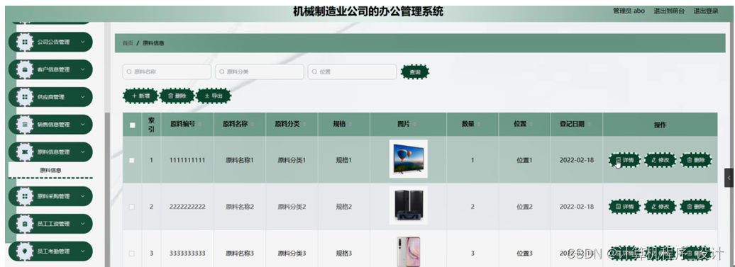 原料信息管理,在原料信息管理页面可以对索引,原料编号,原料名称,原料分类,规格,图片,数量,位置,登记日期等内容进行详情、修改或删除等操作,如图5-10所示。